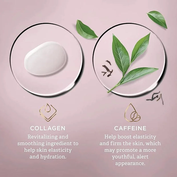 WITH COLLAGEN & CAFFEINE: Collagen helps improve skin elasticity and hydration, while Caffeine boosts firmness and reduces inflammation, enhancing the skin’s youthful appearance.